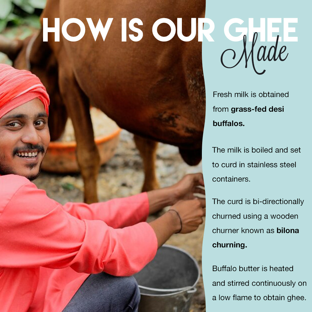 Our Buffalo Ghee is made from pure Buffalo milk which is simmered and curdled overnight, churned through the traditional Bilona method, and then heated to obtain pure ghee. This attentive process gives our Ghee a thick, granular texture, an exquisite aroma, and a strong flavor.